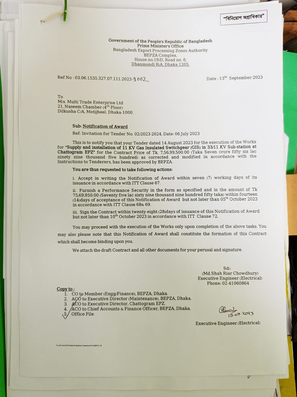 Supply and installation of 11 KV Gas Insulated Switchgear (GIS) in 33/11 KV Sub-station at Chattogram EPZ |