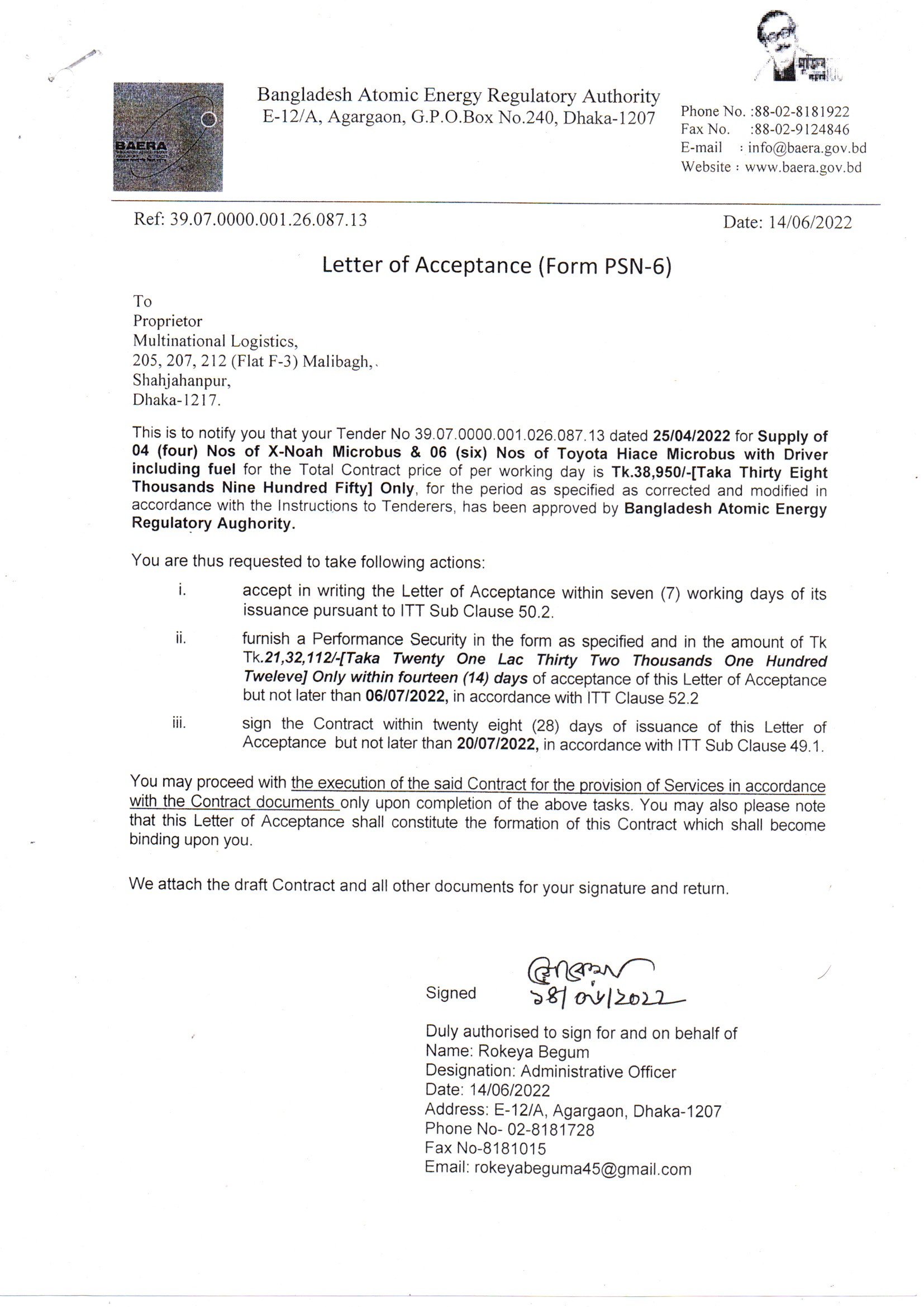 Letter of Acceptance (LOA)