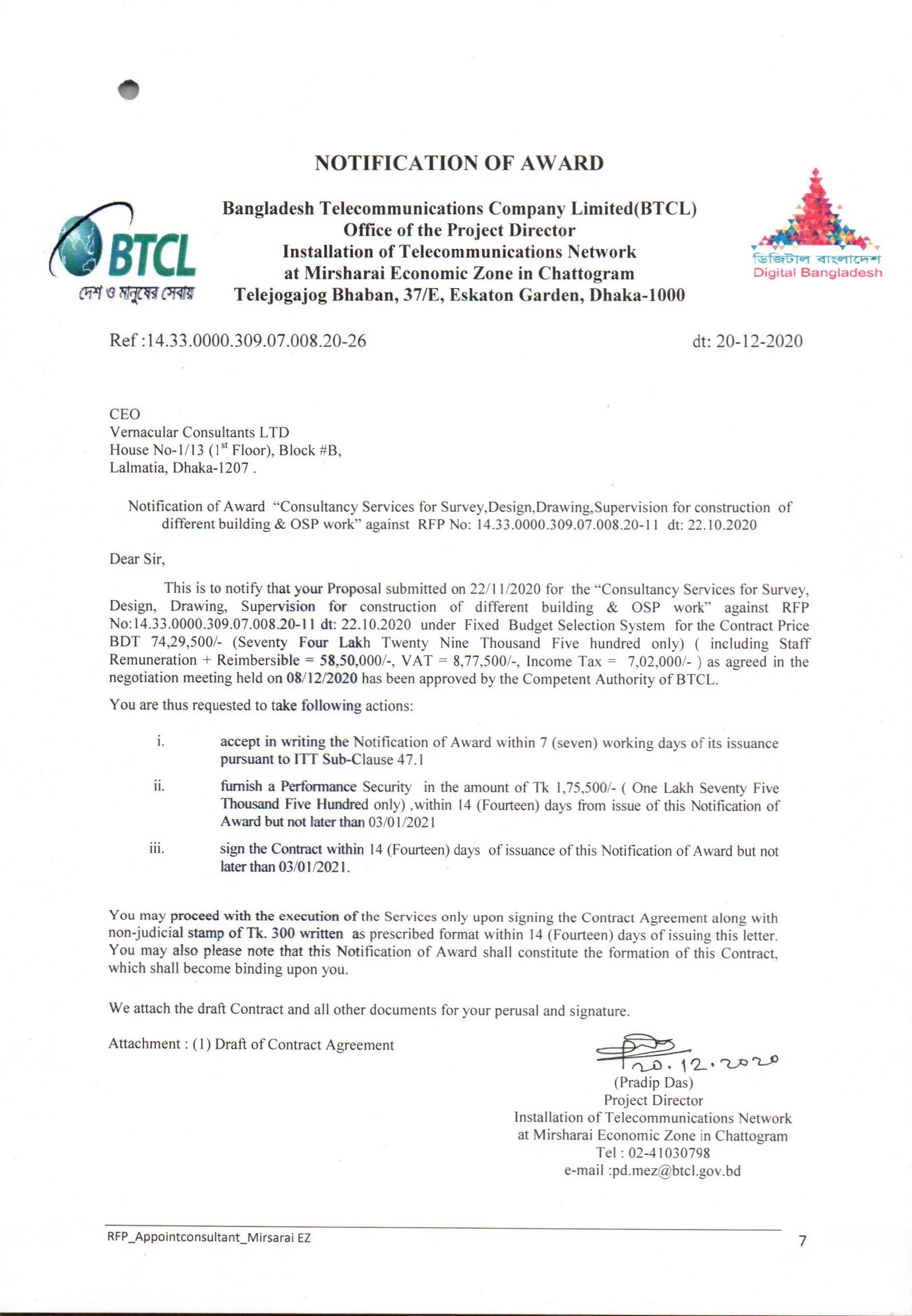 Notification of Award [Contract Package No. : LGED/RADARDP/Nilphamari/W-21]