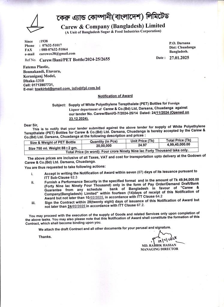 Supply of White Polyethylene Terepthalate (PET) Bottles for Foreign Liquor department of Carew & Co. (BD) Ltd., Darsana, Chuadanga against our tender No. Carew/Bani/G-7/2024-25/14, Dated: 24/11/2024 (opened on 23.12.2024). |